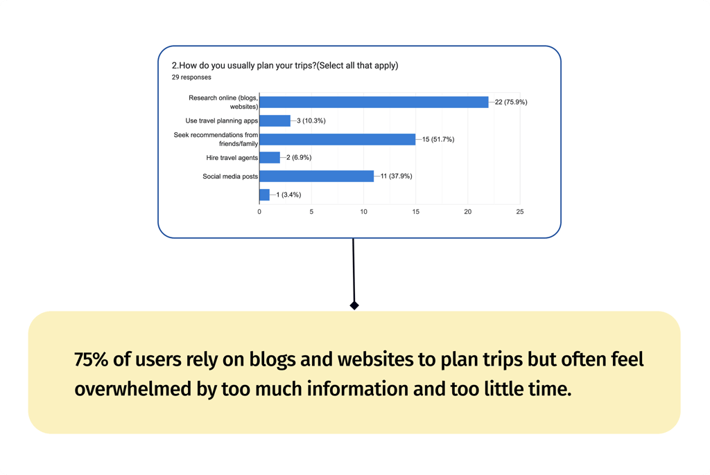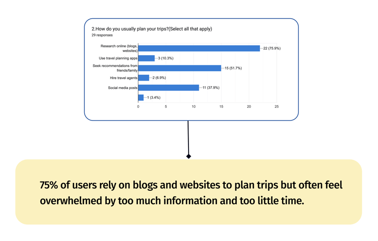 After the survey, we interviewed 7 participants to gain deeper insights into their pain points, focusing on improving travel scheduling through a powerful AI search engine.